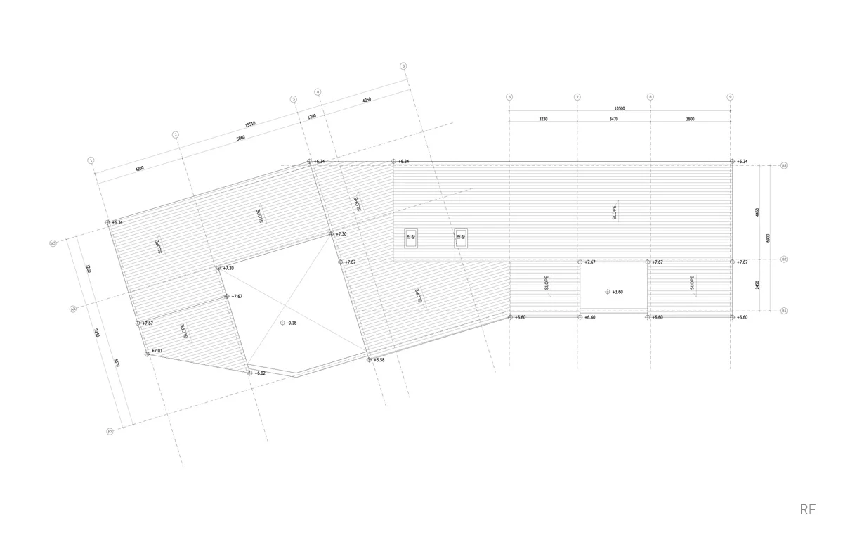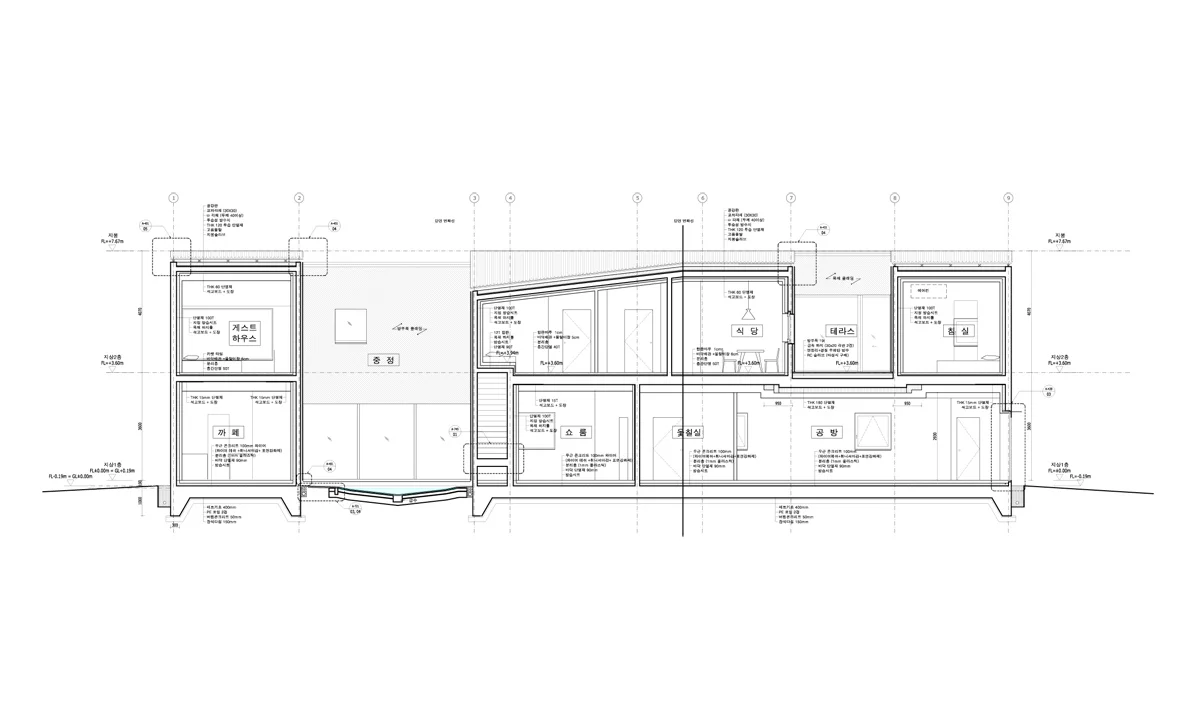 가장 큰 보이드는 카페의 이용객이 사용할 수 있는 중정이다. 키 높이보다 조금 높은 담이 있고, 담에는 개구부가 있어서 들여다 보고자 하면 들여다 볼 수 있는 마당이다. 까페의 손님들이 갇혀 있다는 느낌을 받지 않으면서 보호받기를 원했다.